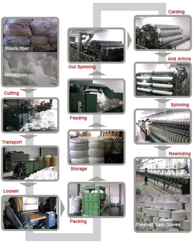 The fiber waste discarded by Textile Industries in Japan will be imported to our company after passing National Customs and various Environmental Protection of Inspection and Quantantine. We will make it into yarns through the professional fiber regeneration device and woolen spinning machine, and then process it into qualified glove yarns by spinner and rewinder. The whole process realizes the commercialization of fiber waste regeneration.