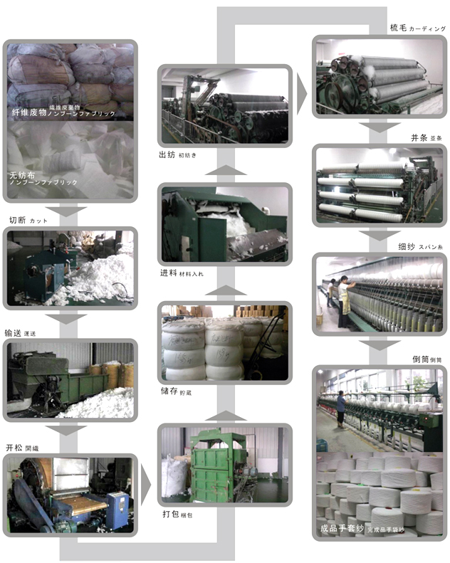 日本纺织业排出的纤维类废料通过国家海关和环保各项检验检疫后再运输至我公司,我公司利用专业纤维再生设备加工,通过开松还原成可利用的纤维原料后进入毛纺机械纺织成最初形态的纱线,然后再经过细纱机和倒筒机加工成合格的手套纱。实现了纤维类废料的再生商品化利用