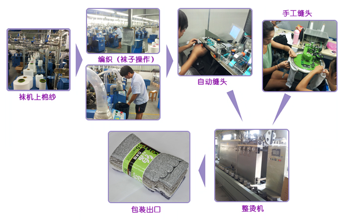 由本公司自行研发生产的袜子纱,经过自动袜机编织成客户需要的规格,然后经整烫、包装、出口。
